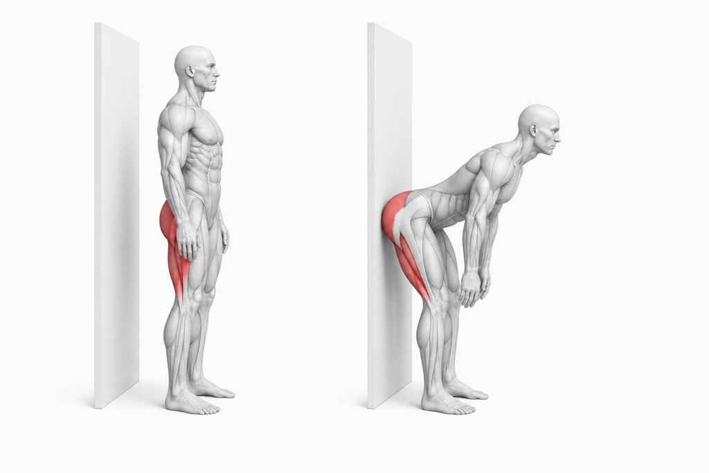 Before you pick up any weight, it’s worth spending a minute on the movement itself. Most beginners skip this and go straight to the dumbbells — then wonder why their lower back takes over. The wall drill solves that. It teaches your body what hinging at the hips actually feels like, with no load and no guesswork. Once you feel it here, you’ll recognise it instantly when you’re holding the dumbbells.