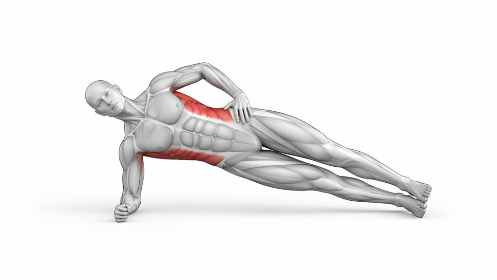 - A steady, building fatigue along the side of your body — obliques and the deep side muscles of your torso.